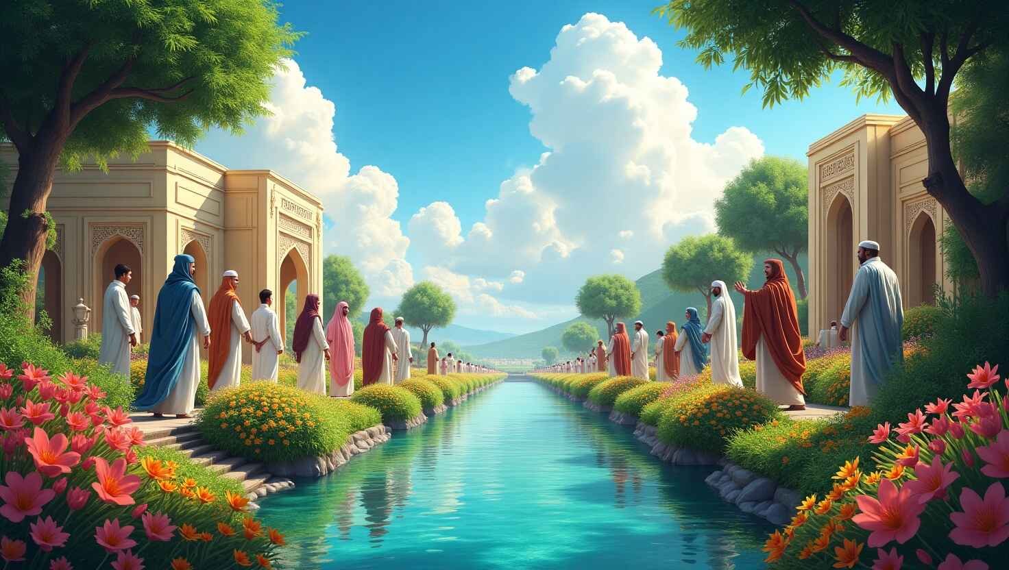 Menurut Husni, gambaran ini mengandung pesan kosmologis. Surga tidak dipersempit dalam bentuk taman kecil, melainkan digambarkan sebesar jagat raya.